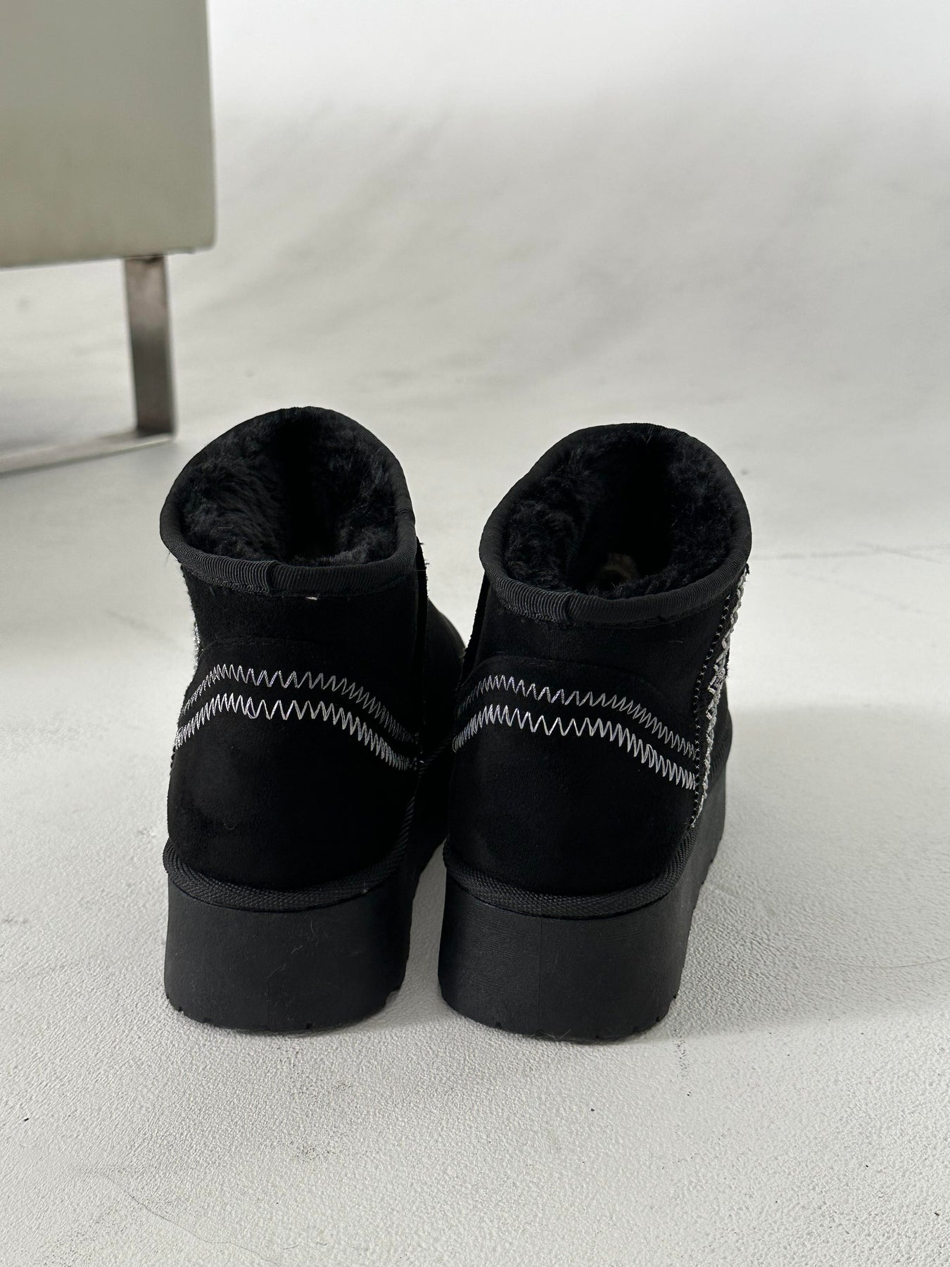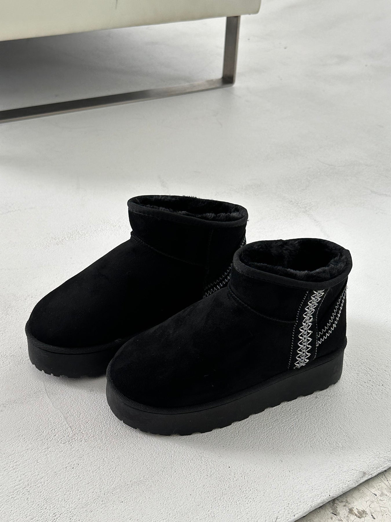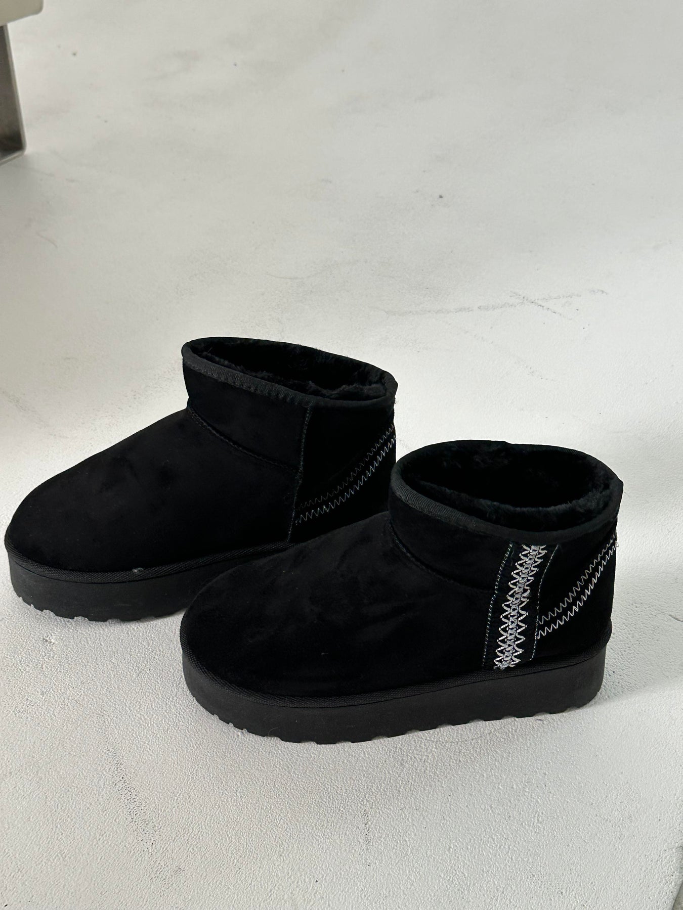 Støvlen har en kort silhuet med indvendigt foer og en markant plateausål. Overfladen er udført i en blød tekstur, der giver struktur og volumen. Udviklet med fokus på efterår og vinterbrug.